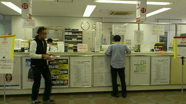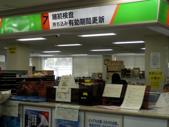 書類を出口付近の窓口に提出して、何か分からないけど書類のチェックしてもらってからまたその書類を受け取り、再び建物内の今度は7番窓口「継続検査、有効期間更新」窓口で書類を提出。