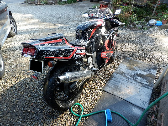とりあえずバイクにちり積もった埃を洗い流す意味合いで、軽く洗車してあげます。